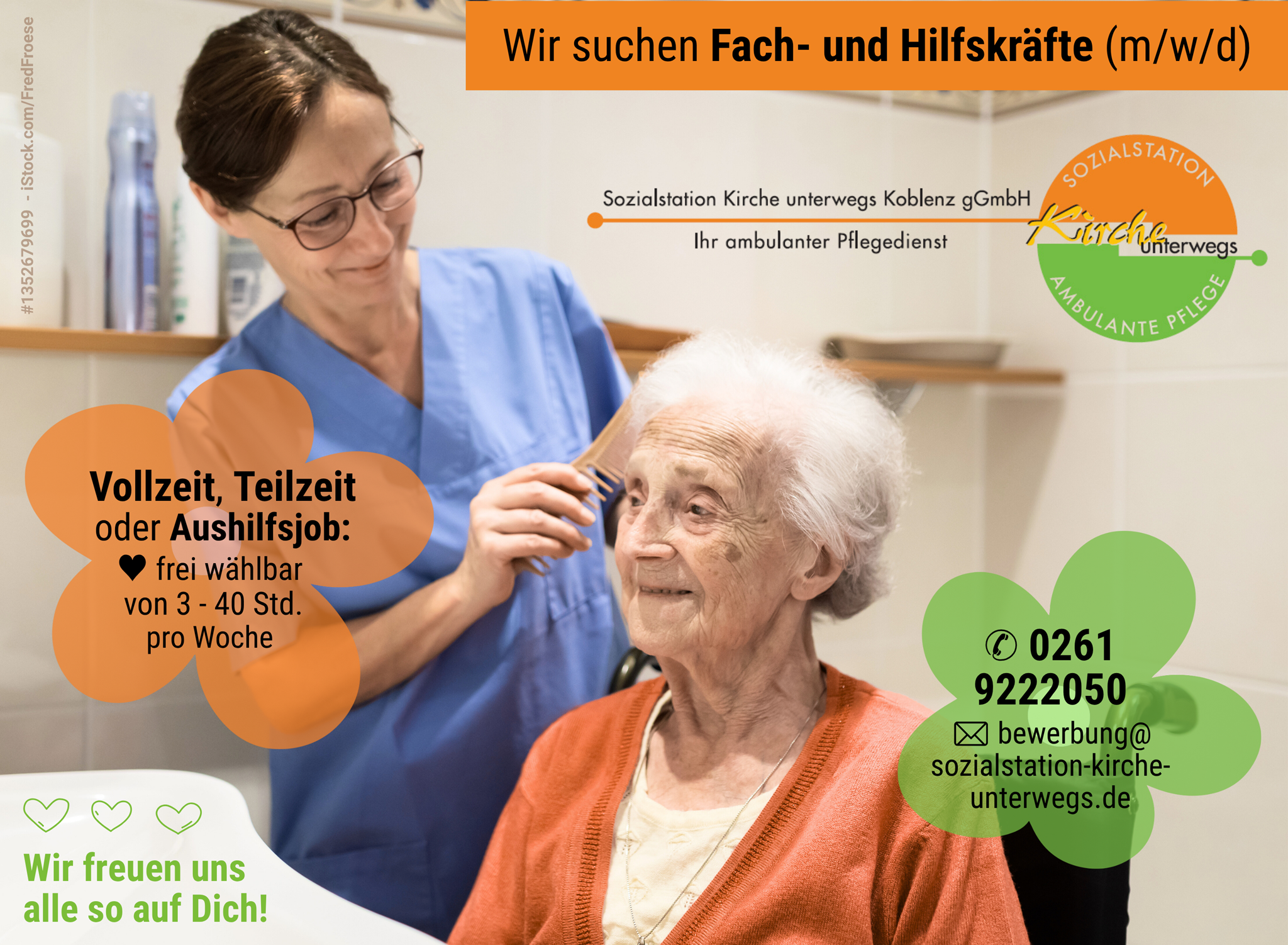Sozialstation Kirche unterwegs Koblenz gGmbH, Personalabteilung, Bogenstraße 53a, 56073 Koblenz.